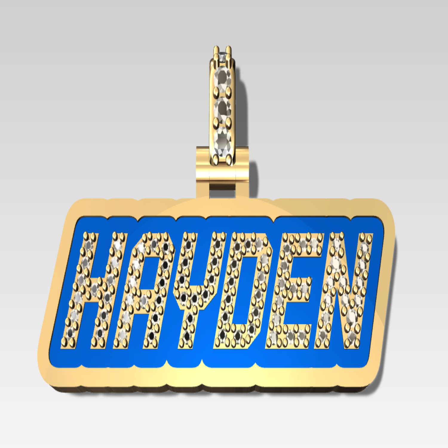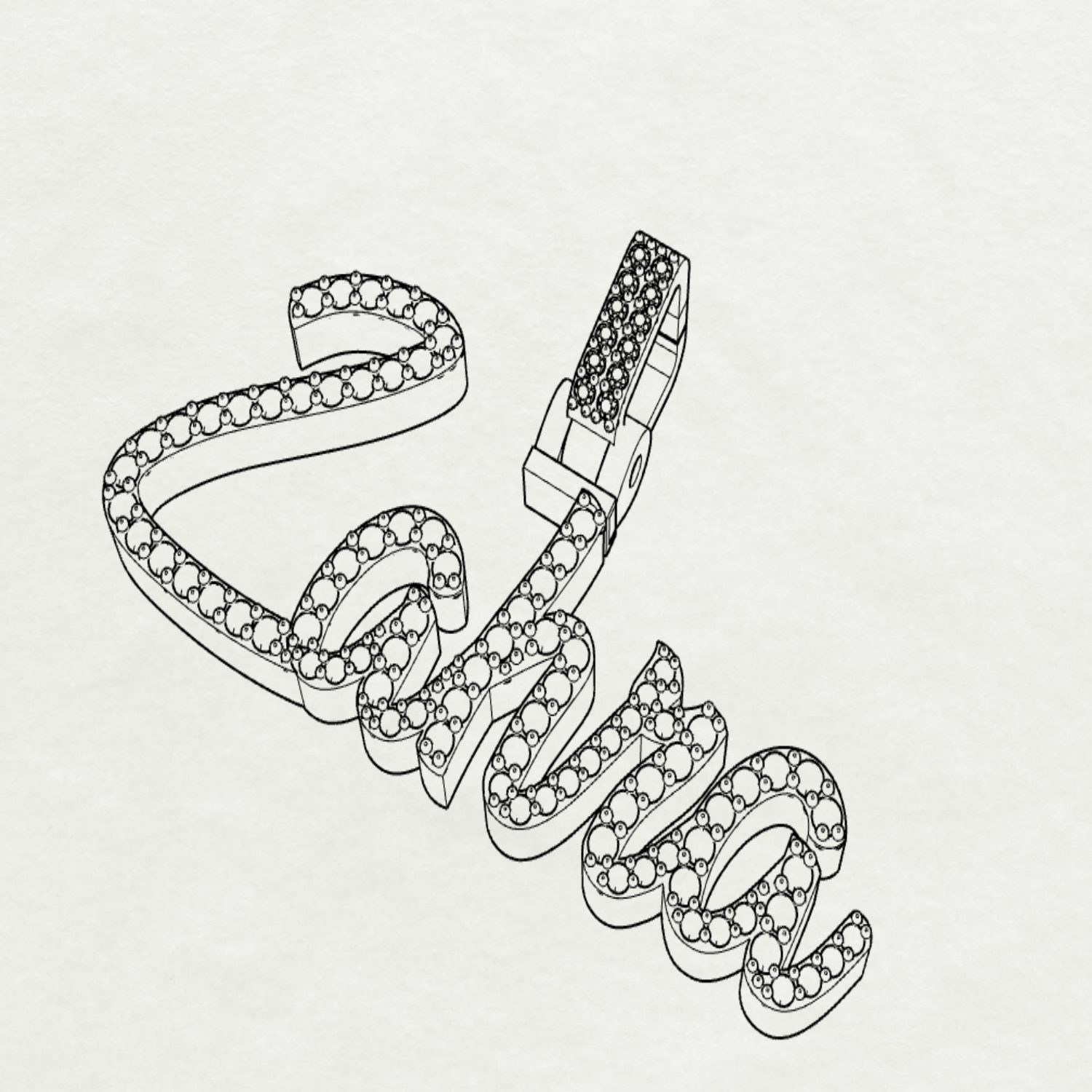 Pendant personalizado en oro con nombre “Sagitario” en pavé de diamantes y corazón esmaltado en rosa.